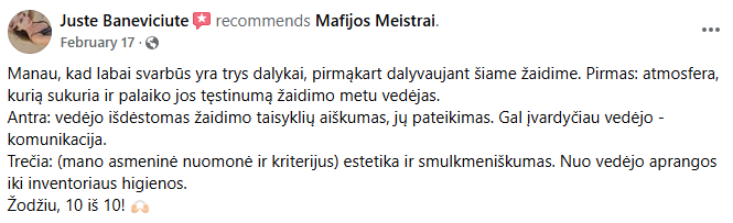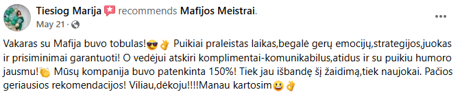 Mafijos žaidimas – puikus būdas pasipuošti šventiniais drabužiais ir žaidimo metu sukurti iškilmingą atmosferą. Šis žaidimas yra ne tik intelektualus, bet ir stilingas. Aprangos kodą nustato užsakovas, o mūsų komanda užtikrina, kad viskas būtų derinama atitinkamai.